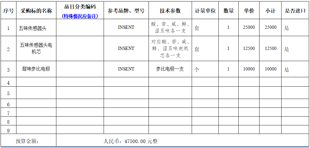 名 称:海南热带海洋学院多功能味觉营养检测系统传感器等耗材项目