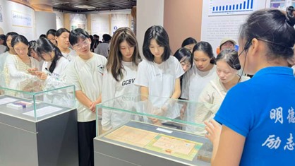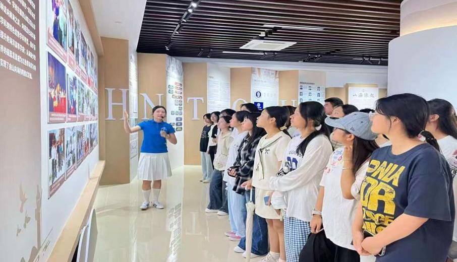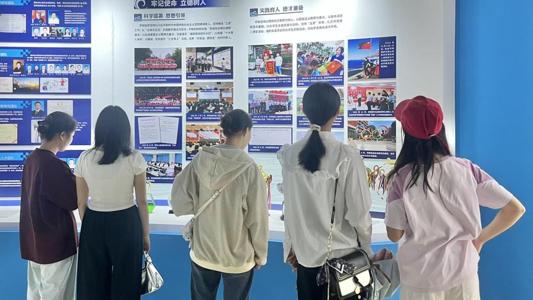 在随后的参观中,玻璃展柜里泛黄的教学手稿、早期的学科建设档案,展区墙上串联学校岁月脉络的老照片,都让新生们真切触摸到历史的温度。在“实践育人”板块,新生们凝视着学校组织的学科竞赛、社会服务活动照片,聆听讲解员讲述前辈师生扎根海岛的奋斗故事,不时发出阵阵感叹。