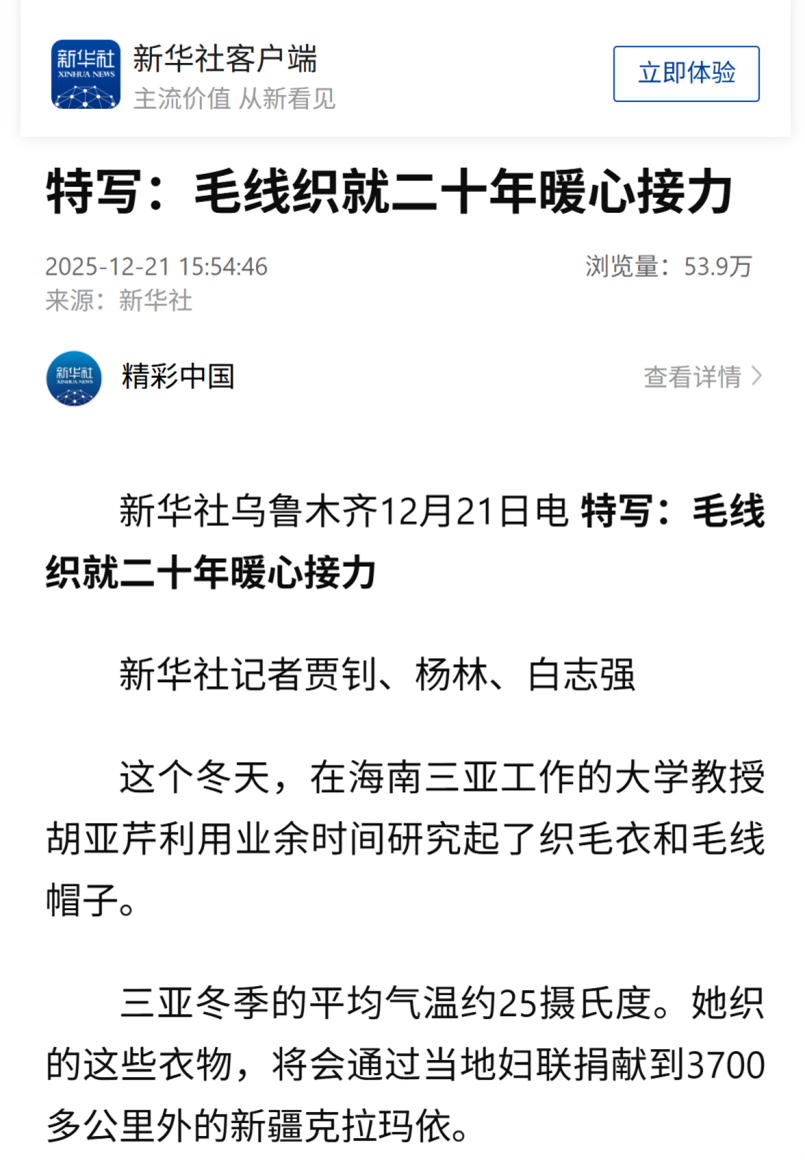 新华社近日报道了海南省妇联组织的“恒爱行动——百万家庭亲情一线牵”公益活动,其中特别以我校Beat365官方网站胡亚芹教授作为开篇典型事例,讲述了她利用工作之余为新疆克拉玛依儿童亲手编织爱心毛衣的感人故事。这一报道在全国范围内展现了我校教师服务社会、奉献爱心的责任担当。